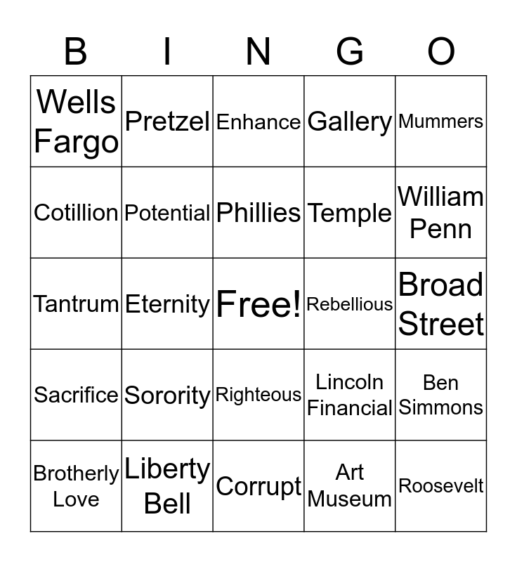 This bingo card has a free space and 24 words: Sorority, Liberty Bell, Phillies, Brotherly Love, Mummers, Wells Fargo, Cotillion, Pretzel, Rebellious, Righteous, Temple, Tantrum, Lincoln Financial, Ben Simmons, Potential, Art Museum, Broad Street, Enhance, William Penn, Eternity, Roosevelt, Sacrifice, Gallery and Corrupt.