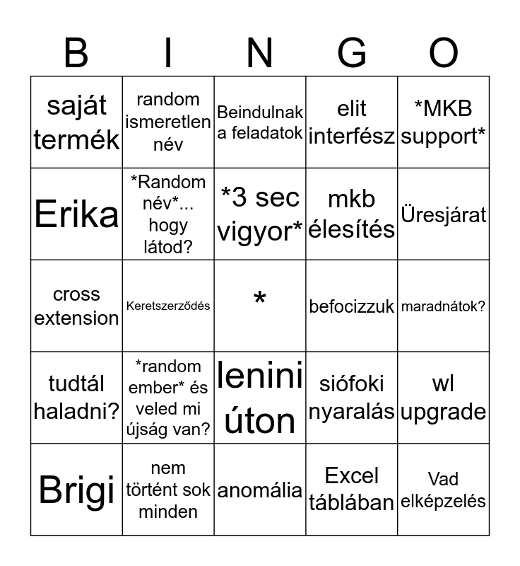 This bingo card has a free space and 24 words: *random ember* és veled mi újság van?, nem történt sok minden, *3 sec vigyor*, Brigi, *MKB support*, saját termék, Erika, random ismeretlen név, befocizzuk, lenini úton, mkb élesítés, cross extension, siófoki nyaralás, wl upgrade, *Random név*... hogy látod?, Excel táblában, maradnátok?, Beindulnak a feladatok, Üresjárat, Keretszerződés, Vad elképzelés, tudtál haladni?, elit interfész and anomália.