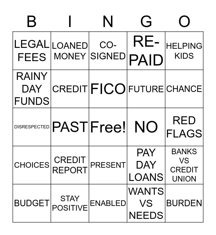 This bingo card has a free space and 24 words: BUDGET, CREDIT REPORT, FICO, WANTS VS NEEDS, HELPING KIDS, LEGAL FEES, LOANED MONEY, CO-SIGNED, NO, RED FLAGS, DISRESPECTED, CREDIT, PAY DAY LOANS, BANKS VS CREDIT UNION, RAINY DAY FUNDS, STAY POSITIVE, ENABLED, RE-PAID, CHANCE, CHOICES, PAST, PRESENT, FUTURE and BURDEN.