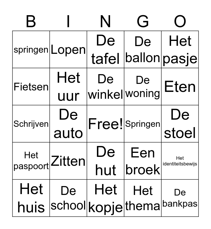 This bingo card has a free space and 24 words: Zitten, De school, De winkel, Het huis, Het pasje, springen, Fietsen, Lopen, Springen, De hut, De woning, Schrijven, Een broek, Het identiteitsbewijs, Het uur, Het thema, De stoel, De tafel, Eten, De auto, De bankpas, Het paspoort, De ballon and Het kopje.