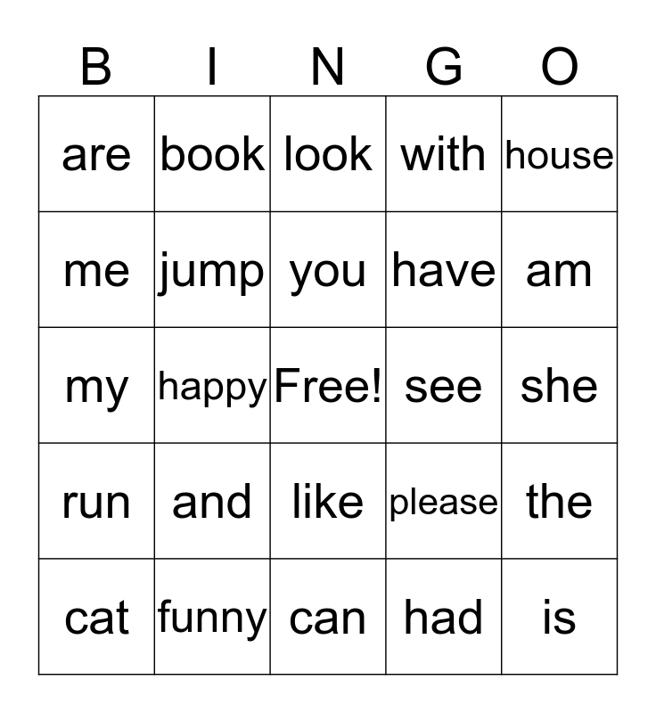 This bingo card has a free space and 24 words: and, funny, you, cat, house, are, me, book, see, like, have, my, please, the, jump, had, she, look, am, happy, is, run, with and can.