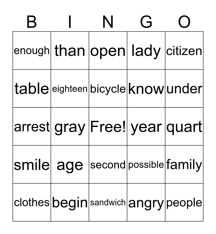 This bingo card has a free space and 24 words: age, begin, bicycle, clothes, citizen, enough, table, than, year, second, know, arrest, possible, family, eighteen, angry, quart, open, under, gray, people, smile, lady and sandwich.
