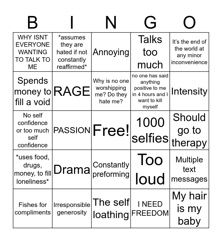This bingo card has a free space and 24 words: Drama, Irresponsible generosity, Why is no one worshipping me? Do they hate me?, Fishes for compliments, It’s the end of the world at any minor inconvenience, WHY ISNT EVERYONE WANTING TO TALK TO ME, Spends money to fill a void, *assumes they are hated if not constantly reaffirmed*, 1000 selfies, Constantly preforming, no one has said anything positive to me in 4 hours and I want to kill myself, No self confidence or too much self confidence, Too loud, Multiple text messages, RAGE, I NEED FREEDOM, Should go to therapy, Annoying, Intensity, PASSION, My hair is my baby, *uses food, drugs, money, to fill loneliness*, Talks too much and The self loathing.