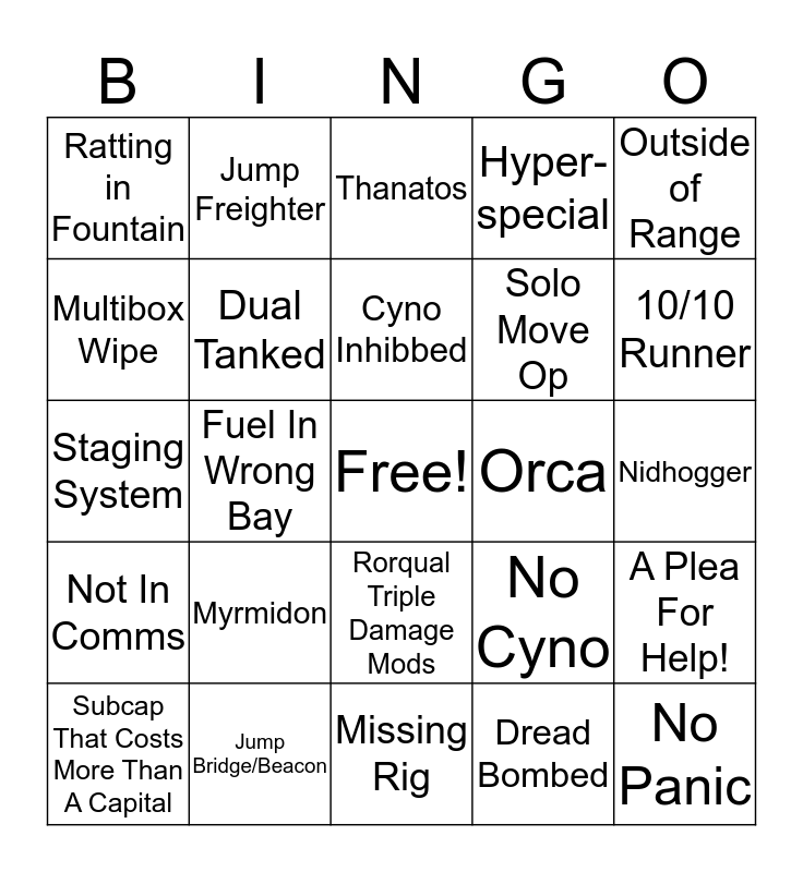 This bingo card has a free space and 36 words: Rorqual Dead On Gate, Carrier/FAX Dead On Gate, Freighter in/out 1DQ, Dual Tanked, No Cyno, Not In Comms, Cyno Inhibbed, No English, Outside of Range, Off Tank, Fuel In Wrong Bay, Hyper-special, Warp with Fighters Out, Orca, 10/10 Runner, Ratting in Fountain, VNI, Myrmidon, No Panic, Thanatos, Nidhogger, A Plea For Help!, Jump Bridge/Beacon, Subcap That Costs More Than A Capital, Missing Rig, Jump Freighter, Staging System, Awox, Solo Move Op, Multibox Wipe, Moon Frack, Clueless, Dread Bombed, Rorqual Triple Damage Mods, Gennel Rages and Dead to Interceptor Gang.