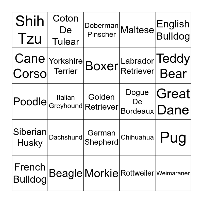 This bingo card has a free space and 24 words: Dachshund, Beagle, Boxer, French Bulldog, English Bulldog, Shih Tzu, Cane Corso, Coton De Tulear, Dogue De Bordeaux, German Shepherd, Labrador Retriever, Poodle, Chihuahua, Pug, Yorkshire Terrier, Rottweiler, Great Dane, Doberman Pinscher, Teddy Bear, Italian Greyhound, Weimaraner, Siberian Husky, Maltese and Morkie.