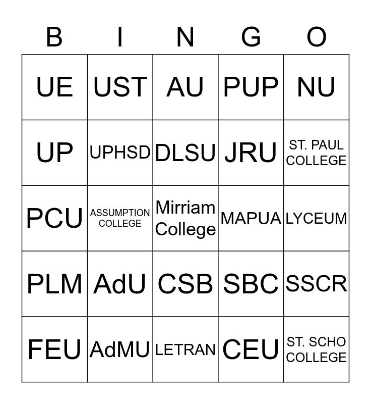 This bingo card has a free space and 24 words: AdU, AdMU, DLSU, FEU, NU, UE, UP, UST, MAPUA, CSB, JRU, PCU, SBC, SSCR, UPHSD, CEU, LYCEUM, AU, ST. PAUL COLLEGE, ASSUMPTION COLLEGE, ST. SCHO COLLEGE, PLM, PUP and LETRAN.