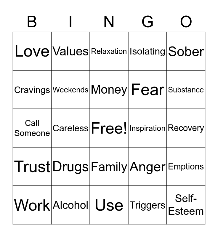 This bingo card has a free space and 24 words: Drugs, Alcohol, Money, Work, Sober, Love, Cravings, Values, Inspiration, Family, Fear, Call Someone, Anger, Emptions, Weekends, Triggers, Recovery, Relaxation, Substance, Careless, Self-Esteem, Trust, Isolating and Use.