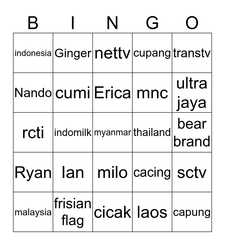 This bingo card has 25 words: Ian, cicak, Erica, malaysia, transtv, indonesia, Nando, Ginger, thailand, milo, mnc, rcti, cacing, sctv, cumi, capung, bear brand, nettv, ultra jaya, indomilk, myanmar, frisian flag, Ryan, cupang and laos.