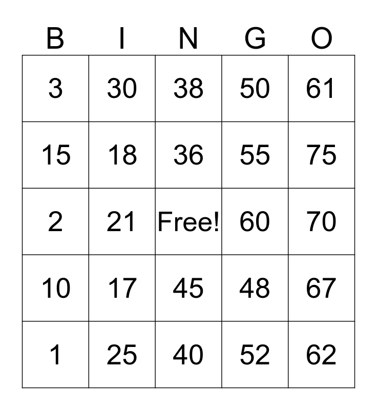 This bingo card has a free space and 24 words: 1, 17, 36, 52, 61, 3, 30, 38, 60, 70, 2, 18, 48, 67, 15, 25, 40, 50, 75, 10, 21, 45, 55 and 62.