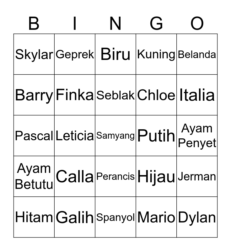 This bingo card has a free space and 24 words: Calla, Galih, Seblak, Hitam, Belanda, Skylar, Barry, Geprek, Putih, Perancis, Chloe, Pascal, Hijau, Jerman, Finka, Mario, Ayam Penyet, Biru, Italia, Leticia, Dylan, Ayam Betutu, Kuning and Spanyol.