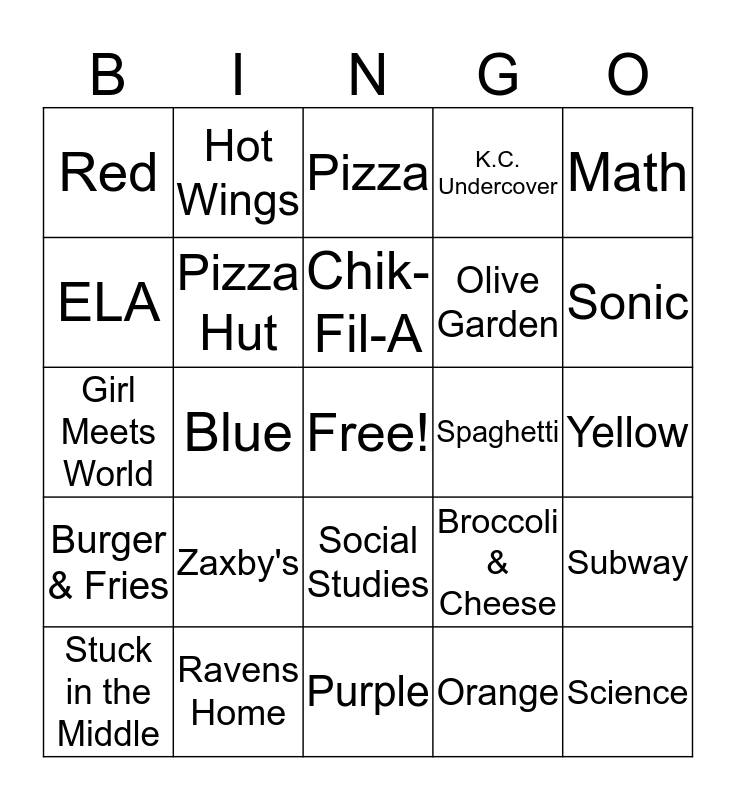 This bingo card has a free space and 27 words: Broccoli & Cheese, Sister Sister, Olive Garden, Purple, ELA, Pizza, Hot Wings, Burger & Fries, Spaghetti, Subway, Girl Meets World, K.C. Undercover, Stuck in the Middle, Ravens Home, Sonic, Delia's, Pizza Hut, Chik-Fil-A, Zaxby's, Red, Yellow, Orange, Blue, Science, Social Studies, Math and Dance.