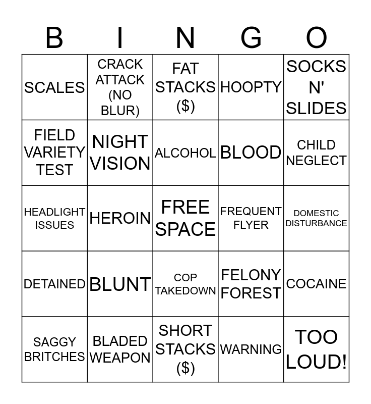 This bingo card has a free space and 124 words: NO I.D., HANDSHAKE/FIST BUMP, ARRESTED, THANK YOU, TRAFFIC STOP, RIGHTS READ, DETAINED, LIAR, LIAR, WARNING, HANDCUFFED, HOT PURSUIT (VEHICLE CHASE), RIDIN' DIRTY, RIDIN' DIRTY TRIFECTA, HANDGUN, EVIL BLACK RIFLE, SHOTGUN, BLADED WEAPON, A.O.W. (ANY OTHER WEAPON), TASER, K9 USED, DRUGS FOUND, HEADLIGHT ISSUES, TAILLIGHT ISSUES, TAG ISSUES, DRUG PARAPHERNALIA, ALCOHOL, HOOPTY, BICYCLE, MOTORCYCLE/ATV, MARIJUANA, COCAINE, METH, HEROIN, BLUNT, NEEDLE, PIPE, TOOTERS, BONG, NARCAN, CIGARETTE, SCALES, PILLS, PILL BOTTLE, NO SHIRT, NO SHOES, NO PANTS, BAREFOOT, SOCKS N' SLIDES, WIFEBEATER TEE, PROBATION, PAROLE, WARRANT, HEAVY HITTER (MULTIPLE WARRANTS), FIRE, AMMO-NATION, SUSPICIOUS VEHICLE, STOLEN VEHICLE, ACCIDENT, CSI, FREQUENT FLYER, FIELD VARIETY TEST, BLUES N' TWOS (LIGHTS & SIREN), NOT MY..., ON THE RUN (FOOT PURSUIT), BURGLARY, LICENSE ISSUES, FIVE FINGER DISCOUNT, COP TAKEDOWN, TATTOOS, DOMESTIC DISTURBANCE, CRYIN', ASSAULT, FIGHT, ROBBERY, BODILY FLUIDS, SPIT HOOD, HOGTIED, LATEX GLOVES, SEARCH GLOVES, SEARCH, GUN SHOW, DON'T FILM ME, ARMCHAIR ATTORNEY, SAGGY BRITCHES, NIGHT VISION, DRUNK WALKIN', MOOBS, BEER GUT, I LIKE BIG BUTTS, TIG OL' BITTIES, GANGSTA, BAGGIES, PACKAGED FOR DISTRIBUTION, WHOLE LOTTA DRUGS, FAT STACKS ($), SHORT STACKS ($), GOOD SAMARITAN, AMBULANCE, FIRE TRUCK, TOO LOUD!, @#$%&?/!, FELONY FOREST, DINDU NUFFIN, YOU WORE THAT?!, LIFE'S RICH PAGEANT, SWAT/TACTICAL ENTRY, KIDS BEHAVING BADLY, CHILD NEGLECT, AIN'T LOVE GRAND, OBSTRUCTION, NO TELL MOTEL, ANIMAL KINGDOM, GAS STATION/CONVENIENCE STORE, BARKING DOG, POWER BUN, MAN BUN, CODE BROWN, CODE YELLOW, BLOOD, SPITTING, TECHNICOLOR YAWN, WHO'S GOT JOKES?, CRACK ATTACK (NO BLUR) and MOON RIVER (YES BLUR).