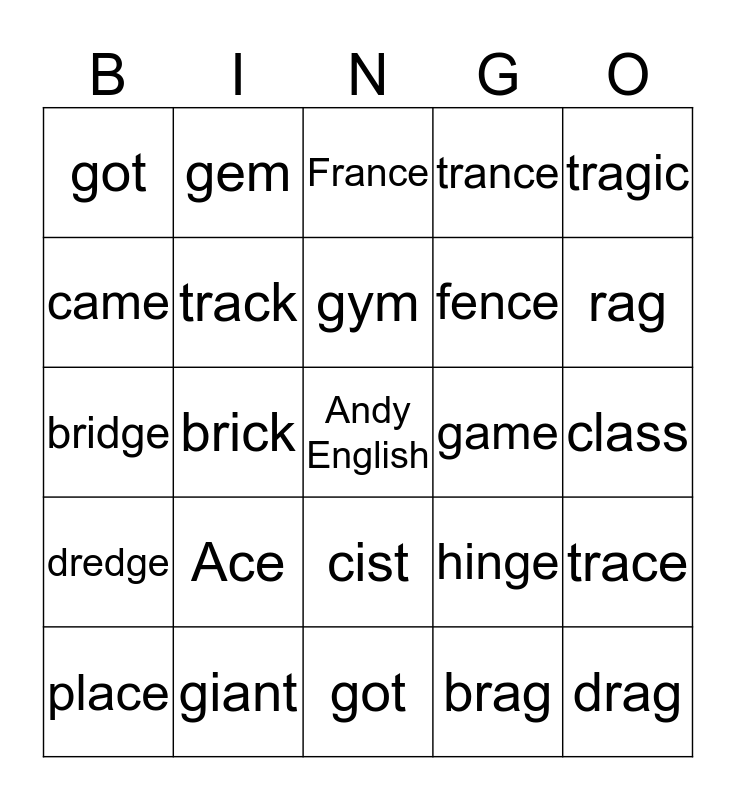 This bingo card has a free space and 24 words: Ace, giant, gym, place, tragic, got, came, gem, game, cist, fence, bridge, hinge, trace, track, brag, class, France, rag, brick, drag, dredge, trance and got.