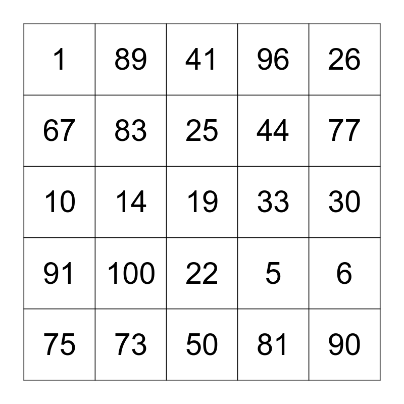 This bingo card has 25 words: 100, 50, 25, 75, 26, 1, 67, 89, 33, 22, 44, 10, 5, 6, 83, 90, 30, 41, 77, 14, 19, 73, 91, 96 and 81.