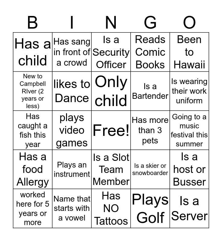 This bingo card has a free space and 24 words: Plays an instrument, Name that starts with a vowel, Only child, worked here for 5 years or more, Been to Hawaii, Has a child, New to Campbell RIver (2 years or less), Has sang in front of a crowd, Has more than 3 pets, Is a Slot Team Member, Is a Bartender, Has caught a fish this year, Is a skier or snowboarder, Is a host or Busser, likes to Dance, Plays Golf, Going to a music festival this summer, Is a Security Officer, Is wearing their work uniform, plays video games, Is a Server, Has a food Allergy, Reads Comic Books and Has NO Tattoos.