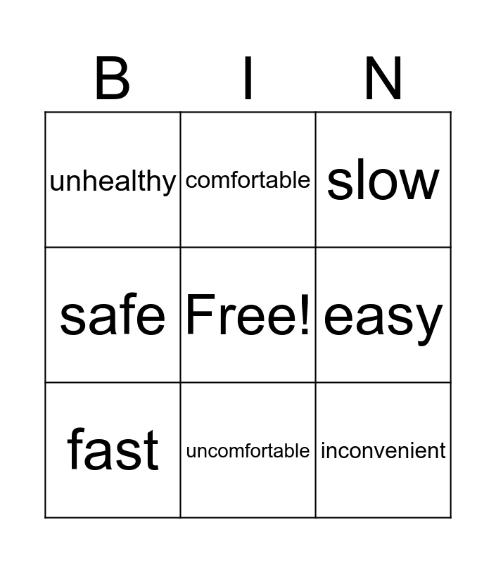 This bingo card has a free space and 8 words: easy, slow, comfortable, fast, unhealthy, inconvenient, safe and uncomfortable.