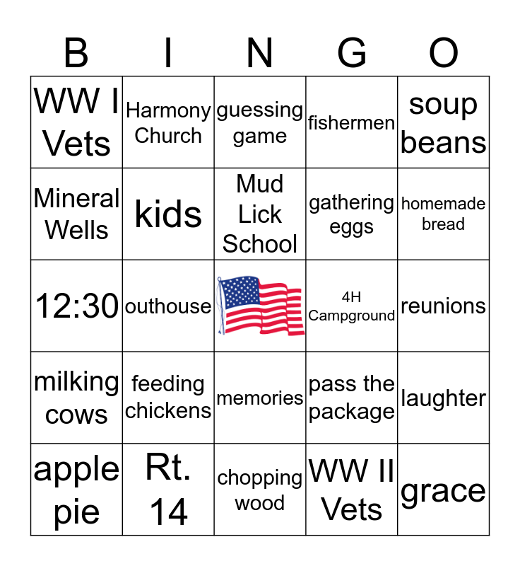This bingo card has a free space and 54 words: hay field, feeding chickens, Wirt County, Slate, reunions, apple butter, kids, hunters, fishermen, corn on the cob, WW I Vets, cornbread, WW II Vets, laughter, homemade noodles, farmers, Mud Lick School, gathering eggs, Rt. 21, apple pie, Rt. 14, chopping wood, 4H Campground, soup beans, swinging bridge, Harmony Church, memories, softball, talent show, fellowship, singing, sausage & bacon, taters & beans, 1913 flood, Mineral Wells, Pettyville, guessing game, pass the package, grace, 12:30, August, pot belly stove, quilting, slopping hogs, Veteran's Park, Air Force Shelter, Jacob, Brown, homemade bread, milking cows, outhouse, Elizabeth, chocolate cake and oldest/youngest.