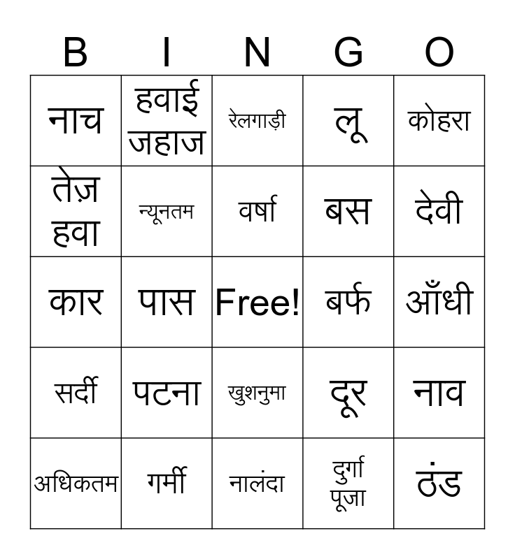 This bingo card has a free space and 26 words: बिहार, पटना, नालंदा, दुर्गा पूजा, देवी, नाच, हवाई जहाज, रेलगाड़ी, बस, नाव, कार, पास, दूर, ठंड, सर्दी, बारिश, वर्षा, बर्फ, कोहरा, अधिकतम, न्यूनतम, खुशनुमा, लू, आँधी, तेज़ हवा and गर्मी.