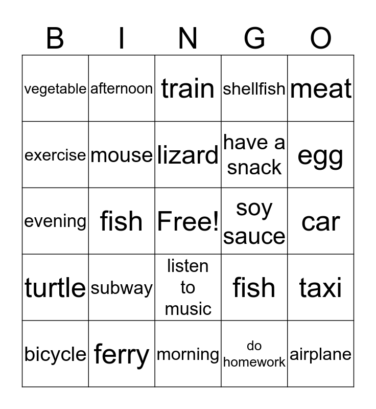 This bingo card has a free space and 36 words: puppy, kitten, rabbit, mouse, fish, turtle, lizard, bird, meat, pasta, fish, shellfish, cereal, soy sauce, egg, vegetable, bus, subway, airplane, train, car, taxi, ferry, bicycle, morning, afternoon, evening, night, have a snack, exercise, use a computer, watch movies, do homework, listen to music, cleanup and wash the car.
