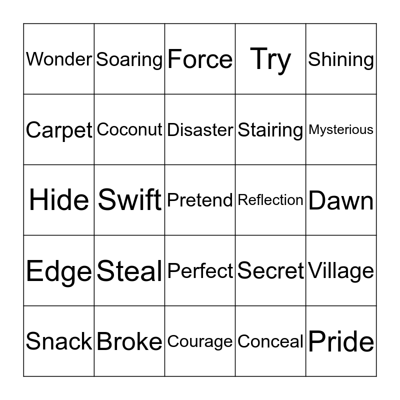 This bingo card has a free space and 24 words: Steal, Broke, Disaster, Snack, Shining, Wonder, Carpet, Soaring, Reflection, Perfect, Stairing, Hide, Secret, Village, Coconut, Conceal, Dawn, Force, Mysterious, Swift, Pride, Edge, Try and Courage.