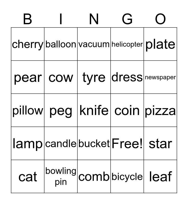 This bingo card has 25 words: candle, comb, tyre, cat, plate, cherry, pear, balloon, coin, bucket, dress, pillow, Free!, star, cow, leaf, pizza, vacuum, newspaper, peg, knife, bowling pin, lamp, helicopter and bicycle.