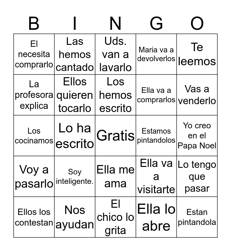 This bingo card has a free space and 24 words: Soy inteligente., Nos ayudan, Los hemos escrito, Ellos los contestan, Te leemos, El necesita comprarlo, La profesora explica, Las hemos cantado, Estamos pintandolos, Ella me ama, Ella va a comprarlos, Los cocinamos, Ella va a visitarte, Lo tengo que pasar, Ellos quieren tocarlo, Ella lo abre, Yo creo en el Papa Noel, Uds. van a lavarlo, Vas a venderlo, Lo ha escrito, Estan pintandola, Voy a pasarlo, Maria va a devolverlos and El chico lo grita.