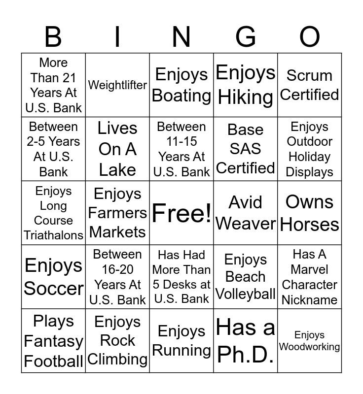 This bingo card has a free space and 33 words: Avid Reader, Between 6-10 Years At U.S. Bank, Enjoys Farmers Markets, Enjoys Hosting BBQs, Enjoys Soccer, Lives On A Lake, Scrum Certified, Plays Fantasy Football, Weightlifter, Enjoys Word Puzzles, Between 11-15 Years At U.S. Bank, Enjoys Boating, Enjoys Cycling, Aspiring Ninja Warrior, Avid Weaver, Enjoys Outdoor Holiday Displays, Enjoys Rock Climbing, Enjoys Long Course Triathalons, Between 16-20 Years At U.S. Bank, Enjoys Beach Volleyball, Has Had More Than 5 Desks at U.S. Bank, Less Than 1 Year At U.S. Bank, More Than 21 Years At U.S. Bank, Owns Horses, Enjoys Running, Enjoys Woodworking, Enjoys Hiking, Base SAS Certified, Between 2-5 Years At U.S. Bank, Has A Marvel Character Nickname, Likes Food Trucks, Has a Ph.D. and Makes Homemade Beer and Wine.