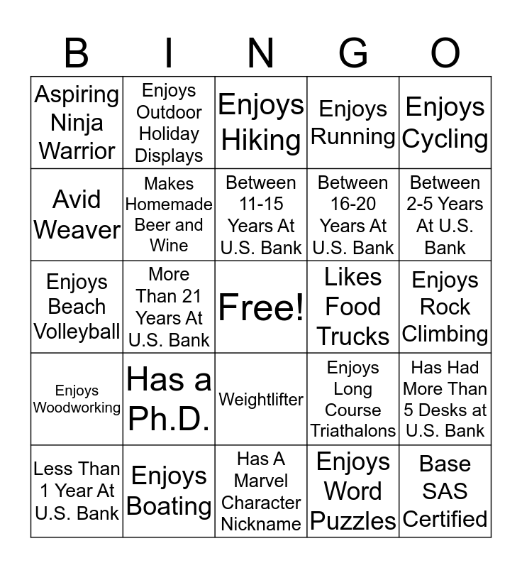 This bingo card has a free space and 26 words: Weightlifter, Enjoys Word Puzzles, Between 11-15 Years At U.S. Bank, Enjoys Boating, Enjoys Cycling, Aspiring Ninja Warrior, Avid Weaver, Enjoys Outdoor Holiday Displays, Enjoys Rock Climbing, Enjoys Long Course Triathalons, Between 16-20 Years At U.S. Bank, Enjoys Beach Volleyball, Has Had More Than 5 Desks at U.S. Bank, Less Than 1 Year At U.S. Bank, More Than 21 Years At U.S. Bank, Owns Horses, Enjoys Running, Enjoys Woodworking, Enjoys Hiking, Base SAS Certified, Between 2-5 Years At U.S. Bank, Has A Marvel Character Nickname, Likes Food Trucks, Has a Ph.D., Makes Homemade Beer and Wine and Plays Guitar.