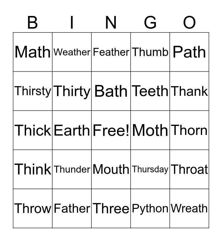 This bingo card has a free space and 24 words: Thunder, Father, Bath, Throw, Path, Math, Thirsty, Weather, Moth, Mouth, Teeth, Thick, Thursday, Throat, Thirty, Python, Thorn, Feather, Thank, Earth, Wreath, Think, Thumb and Three.