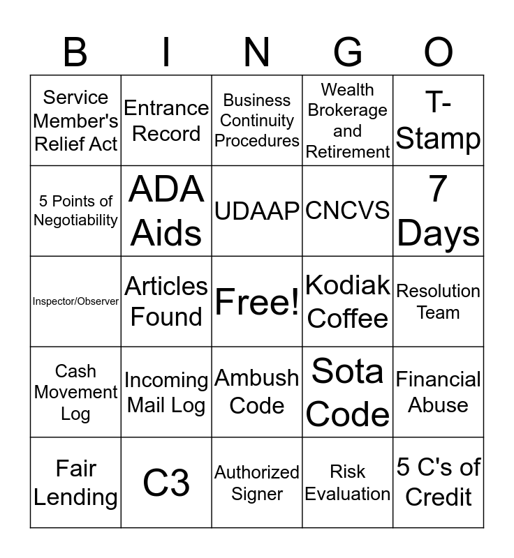 This bingo card has a free space and 24 words: Incoming Mail Log, C3, UDAAP, Fair Lending, T-Stamp, Service Member's Relief Act, 5 Points of Negotiability, Entrance Record, Kodiak Coffee, Ambush Code, CNCVS, Inspector/Observer, Sota Code, Financial Abuse, ADA Aids, Risk Evaluation, Resolution Team, Business Continuity Procedures, 7 Days, Articles Found, 5 C's of Credit, Cash Movement Log, Wealth Brokerage and Retirement and Authorized Signer.