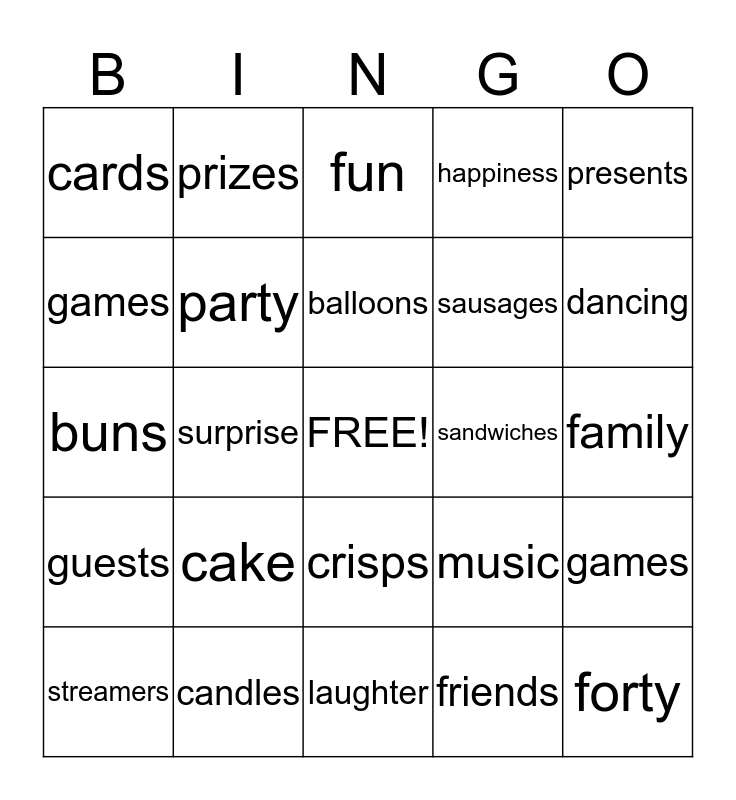 This bingo card has a free space and 24 words: cake, candles, balloons, streamers, presents, cards, games, prizes, sandwiches, crisps, sausages, buns, music, games, party, friends, family, fun, dancing, surprise, forty, guests, happiness and laughter.
