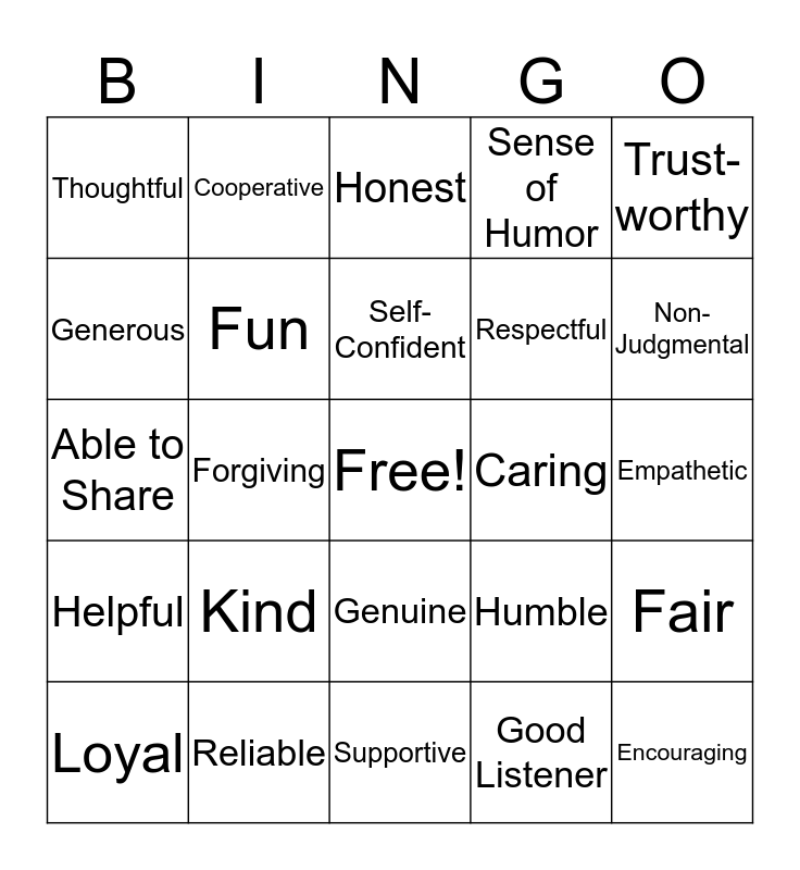 This bingo card has a free space and 24 words: Kind, Reliable, Self-Confident, Loyal, Trust-worthy, Thoughtful, Generous, Cooperative, Caring, Genuine, Respectful, Able to Share, Humble, Fair, Fun, Good Listener, Empathetic, Honest, Non- Judgmental, Forgiving, Encouraging, Helpful, Sense of Humor and Supportive.