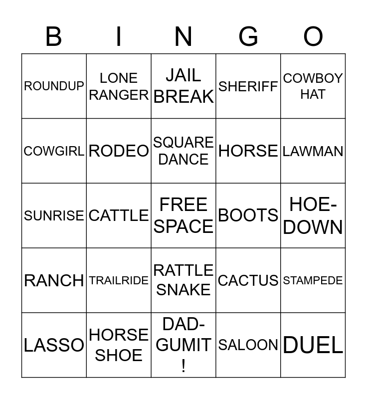 This bingo card has a free space and 24 words: TRAILRIDE, HORSE SHOE, SQUARE DANCE, LASSO, COWBOY HAT, ROUNDUP, COWGIRL, LONE RANGER, BOOTS, RATTLE SNAKE, HORSE, SUNRISE, CACTUS, STAMPEDE, RODEO, SALOON, HOE- DOWN, JAIL BREAK, LAWMAN, CATTLE, DUEL, RANCH, SHERIFF and DAD- GUMIT !.