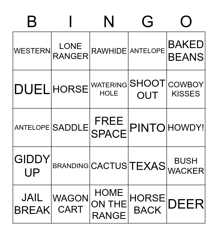 This bingo card has a free space and 24 words: BRANDING, WAGON CART, WATERING HOLE, JAIL BREAK, BAKED BEANS, WESTERN, DUEL, LONE RANGER, PINTO, CACTUS, SHOOT OUT, ANTELOPE, TEXAS, BUSH WACKER, HORSE, HORSE BACK, HOWDY!, RAWHIDE, COWBOY KISSES, SADDLE, DEER, GIDDY UP, ANTELOPE and HOME ON THE RANGE.