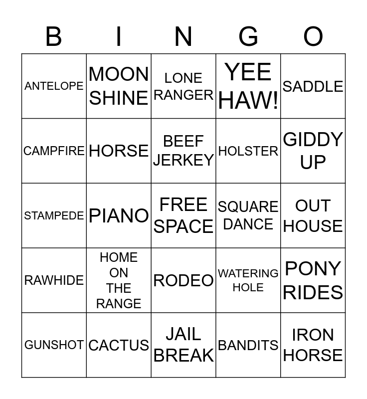 This bingo card has a free space and 24 words: HOME ON THE RANGE, CACTUS, BEEF JERKEY, GUNSHOT, SADDLE, ANTELOPE, CAMPFIRE, MOON SHINE, SQUARE DANCE, RODEO, HOLSTER, STAMPEDE, WATERING HOLE, PONY RIDES, HORSE, BANDITS, OUT HOUSE, LONE RANGER, GIDDY UP, PIANO, IRON HORSE, RAWHIDE, YEE HAW! and JAIL BREAK.