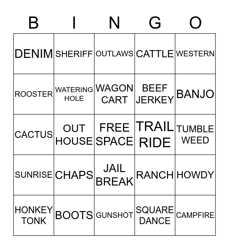 This bingo card has a free space and 24 words: CHAPS, BOOTS, WAGON CART, HONKEY TONK, WESTERN, DENIM, ROOSTER, SHERIFF, TRAIL RIDE, JAIL BREAK, BEEF JERKEY, CACTUS, RANCH, HOWDY, WATERING HOLE, SQUARE DANCE, TUMBLE WEED, OUTLAWS, BANJO, OUT HOUSE, CAMPFIRE, SUNRISE, CATTLE and GUNSHOT.