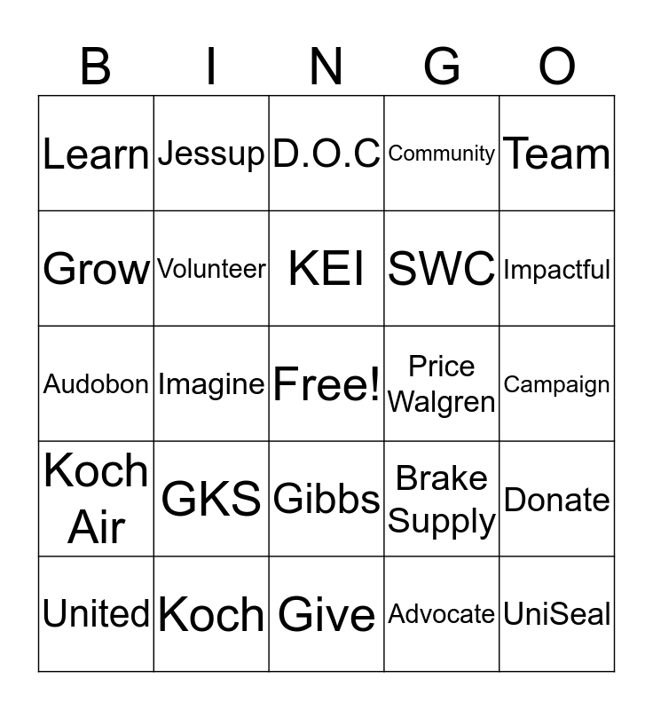 This bingo card has a free space and 24 words: GKS, Koch, KEI, United, Team, Learn, Grow, Jessup, Price Walgren, Gibbs, SWC, Audobon, Brake Supply, Donate, Volunteer, Advocate, Campaign, D.O.C, Impactful, Imagine, UniSeal, Koch Air, Community and Give.