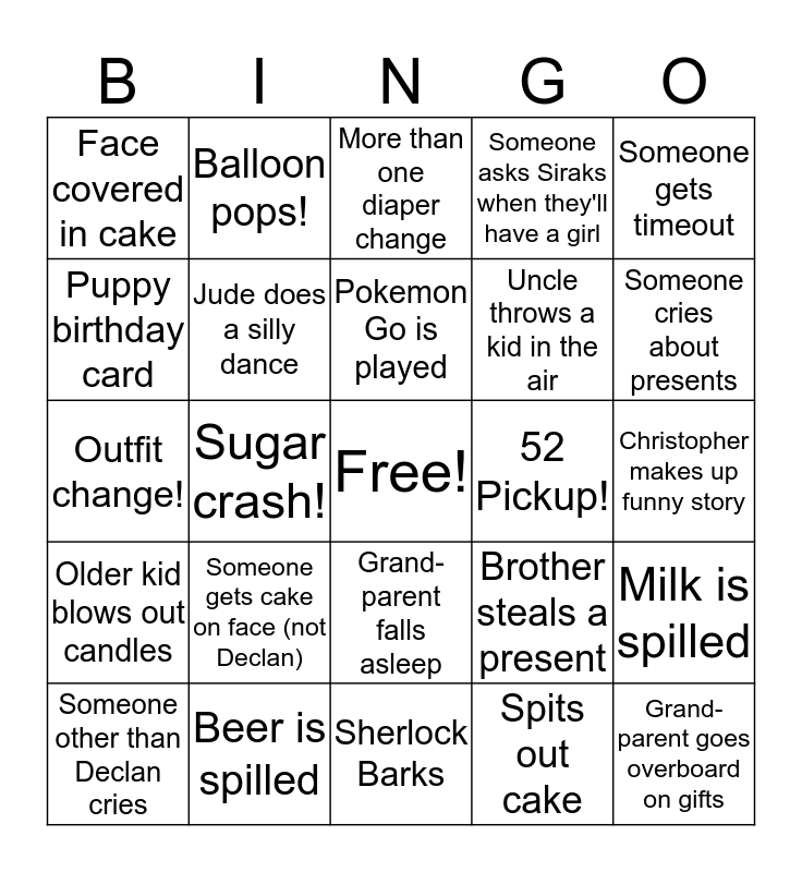 This bingo card has a free space and 24 words: Someone gets cake on face (not Declan), Beer is spilled, Pokemon Go is played, Someone other than Declan cries, Someone gets timeout, Face covered in cake, Puppy birthday card, Balloon pops!, 52 Pickup!, Grand- parent falls asleep, Uncle throws a kid in the air, Outfit change!, Brother steals a present, Milk is spilled, Jude does a silly dance, Spits out cake, Christopher makes up funny story, More than one diaper change, Someone cries about presents, Sugar crash!, Grand-parent goes overboard on gifts, Older kid blows out candles, Someone asks Siraks when they'll have a girl and Sherlock Barks.