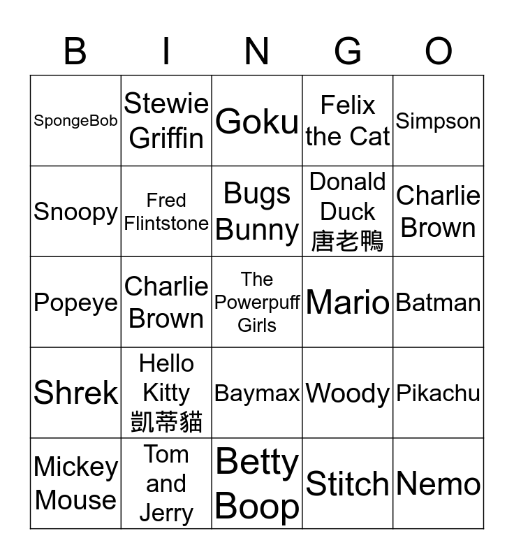 This bingo card has a free space and 24 words: Hello Kitty 凱蒂貓, Tom and Jerry, Bugs Bunny, Mickey Mouse, Simpson, SpongeBob, Snoopy, Stewie Griffin, Mario, Baymax, Donald Duck 唐老鴨, Popeye, Woody, Pikachu, Fred Flintstone, Stitch, Batman, Goku, Charlie Brown, Charlie Brown, Nemo, Shrek, Felix the Cat and Betty Boop.