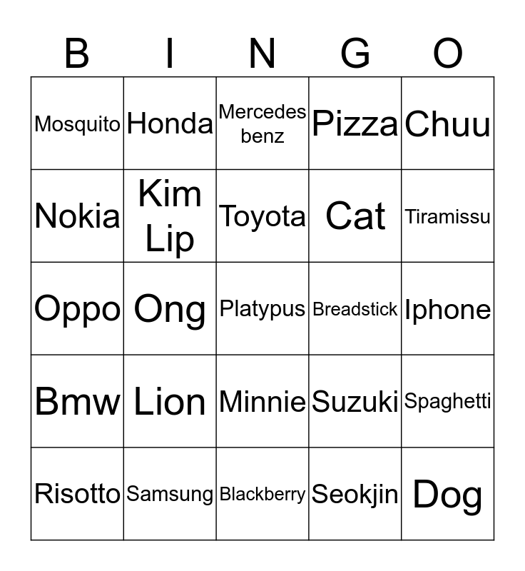 This bingo card has 25 words: Lion, Blackberry, Toyota, Risotto, Chuu, Mosquito, Nokia, Honda, Breadstick, Minnie, Cat, Oppo, Suzuki, Spaghetti, Kim Lip, Dog, Iphone, Mercedes benz, Tiramissu, Ong, Platypus, Samsung, Bmw, Pizza and Seokjin.