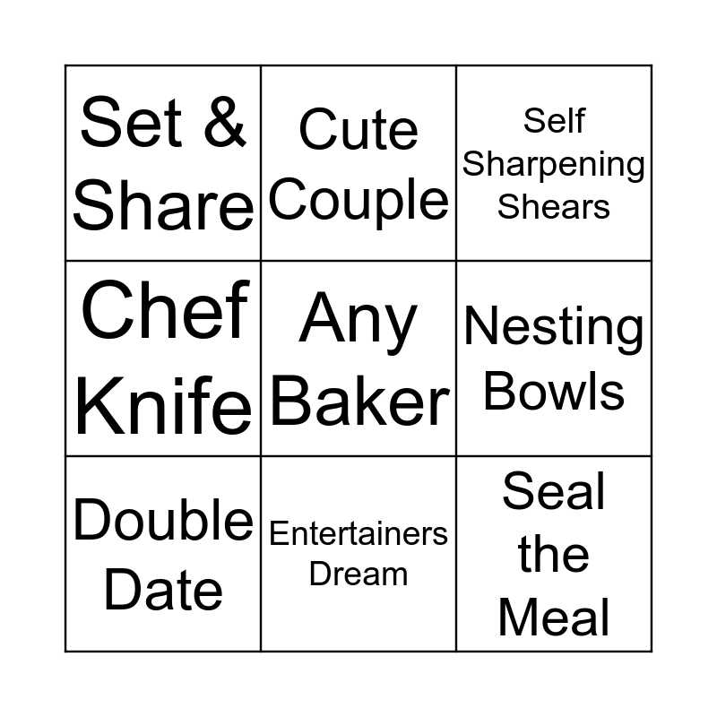 This bingo card has 12 words: Unlimit-lid Possibilities Bundle, Any Baker, Seal the Meal, Chef Knife, Cute Couple, Nesting Bowls, Double Date, Entertainers Dream, Self Sharpening Shears, Set & Share, Handle It Hot Oven Gloves and Dream Clean.