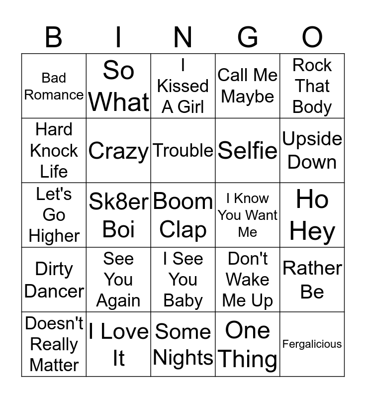 This bingo card has 46 words: Feel So Close, Boom Clap, Grenade, Some Nights, See You Again, Baby, So What, Tik Tok, Hard Knock Life, Royals, Crazy, Call Me Maybe, Rather Be, Don't Wake Me Up, One More Night, Heart Attack, Trouble, I Know You Want Me, Closer, Rock That Body, Sk8er Boi, One Thing, Bad Romance, Selfie, Without Me, Upside Down, Doesn't Really Matter, If It's Love, I See You Baby, Dirty Dancer, Check On It, Baby Come Over, This Afternoon, Back 2 Good, Wild Ones, I Love It, Ho Hey, Dirty, Jenny From The Block, All About That Bass, Fergalicious, I Kissed A Girl, Let's Go Higher, Sexy Chick, Shake It Off and Hollaback Girl.