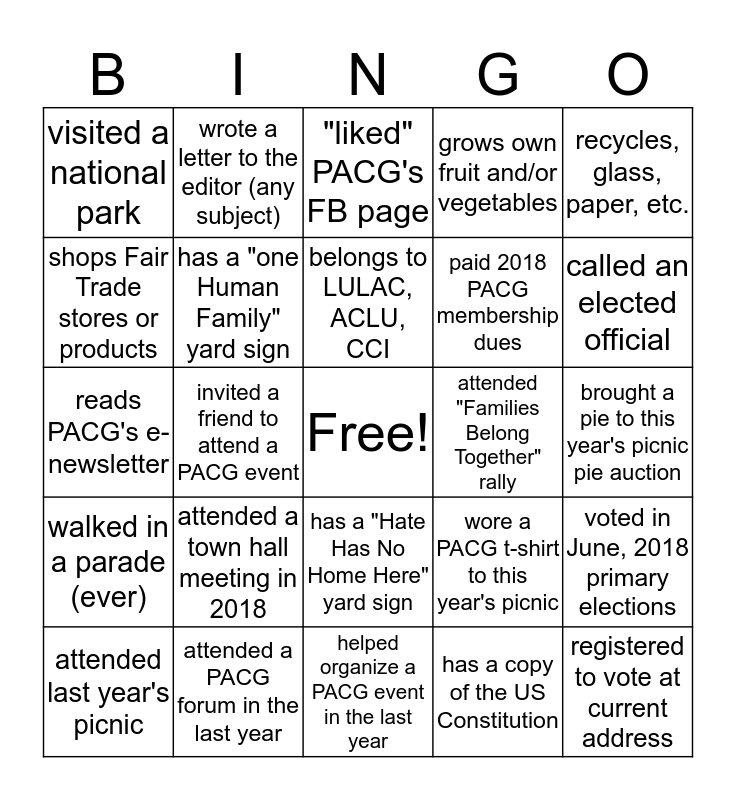This bingo card has a free space and 24 words: attended last year's picnic, attended a town hall meeting in 2018, belongs to LULAC, ACLU, CCI, has a copy of the US Constitution, recycles, glass, paper, etc., visited a national park, wrote a letter to the editor (any subject), "liked" PACG's FB page, attended "Families Belong Together" rally, brought a pie to this year's picnic pie auction, reads PACG's e-newsletter, has a "one Human Family" yard sign, wore a PACG t-shirt to this year's picnic, voted in June, 2018 primary elections, shops Fair Trade stores or products, attended a PACG forum in the last year, helped organize a PACG event in the last year, grows own fruit and/or vegetables, called an elected official, walked in a parade (ever), invited a friend to attend a PACG event, has a "Hate Has No Home Here" yard sign, paid 2018 PACG membership dues and registered to vote at current address.