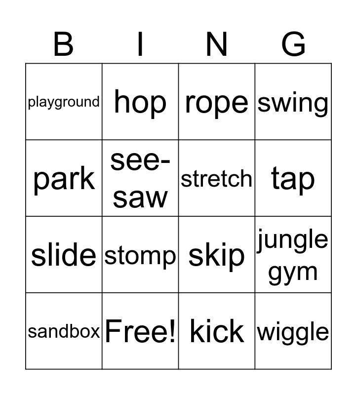 This bingo card has 16 words: Free!, jungle gym, rope, playground, slide, hop, skip, kick, park, see-saw, sandbox, swing, stomp, tap, stretch and wiggle.
