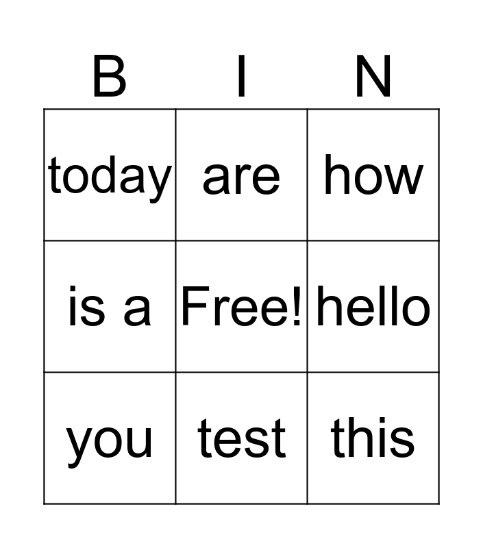 This bingo card has a free space and 8 words: hello, how, are, you, today, this, is a and test.