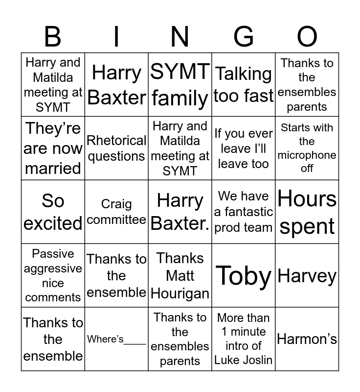 This bingo card has a free space and 25 words: Thanks to the ensemble, Thanks to the ensembles parents, Harry and Matilda meeting at SYMT, Thanks to the ensemble, Thanks to the ensembles parents, Harry and Matilda meeting at SYMT, They’re are now married, Harry Baxter, We have a fantastic prod team, Thanks Matt Hourigan, If you ever leave I’ll leave too, So excited, Toby, Harvey, Rhetorical questions, 24 shows, Hours spent, SYMT family, Starts with the microphone off, Craig committee, Harmon’s, Where’s____, Passive aggressive nice comments, Talking too fast and More than 1 minute intro of Luke Joslin.