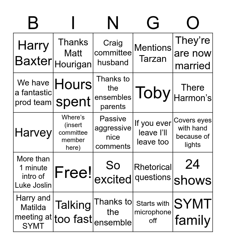 This bingo card has 25 words: Free!, Thanks to the ensemble, Thanks to the ensembles parents, Harry and Matilda meeting at SYMT, They’re are now married, Harry Baxter, We have a fantastic prod team, Thanks Matt Hourigan, If you ever leave I’ll leave too, So excited, Toby, Harvey, Rhetorical questions, 24 shows, Hours spent, SYMT family, Covers eyes with hand because of lights, Craig committee husband, There Harmon’s, Where’s (insert committee member here), Passive aggressive nice comments, Talking too fast, More than 1 minute intro of Luke Joslin, Mentions Tarzan and Starts with microphone off.