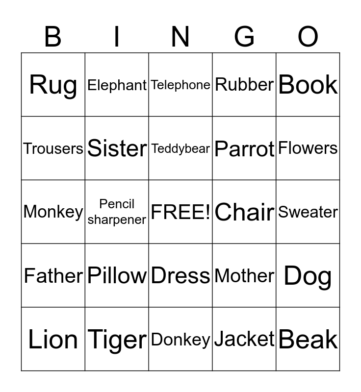 This bingo card has a free space and 36 words: Grandmother, Grandfather, Brother, Sister, Mother, Father, Teddybear, Ball, Book, Pencil, Pencil sharpener, Rubber, Lamp, Chair, Flowers, Rug, Sun, Pillow, Beak, Telephone, Sweater, Dog, Tiger, Lion, Donkey, Elephant, Monkey, Giraffe, Parrot, Trousers, Socks, Shoes, Jacket, Dress, Skirt and T-shirt.