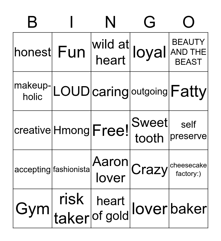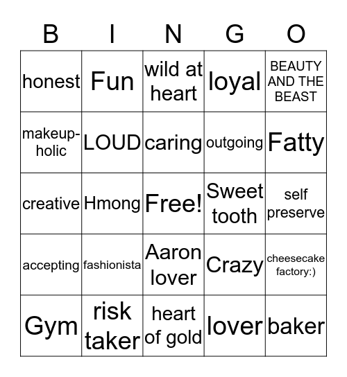 This bingo card has a free space and 24 words: fashionista, risk taker, caring, Gym, BEAUTY AND THE BEAST, honest, makeup-holic, Fun, Sweet tooth, Aaron lover, outgoing, creative, Crazy, cheesecake factory:), LOUD, lover, self preserve, wild at heart, Fatty, Hmong, baker, accepting, loyal and heart of gold.