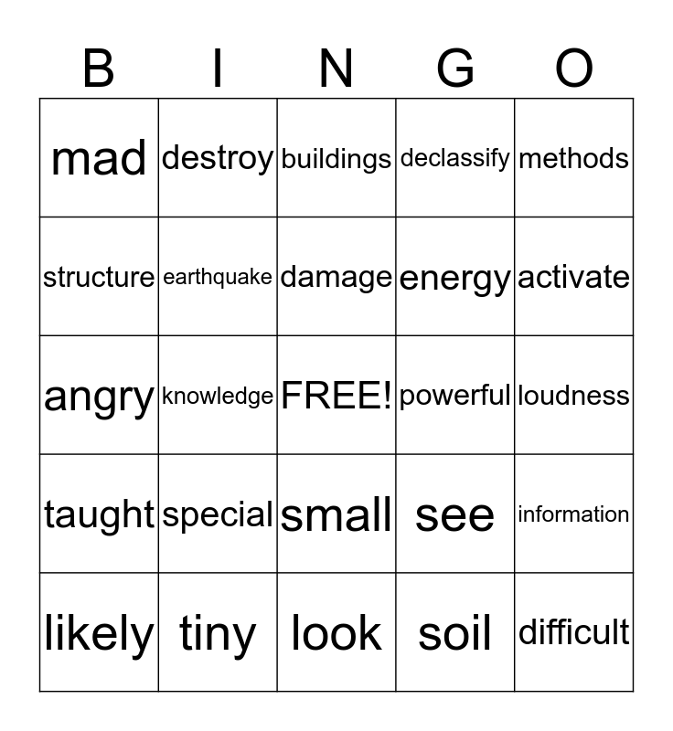This bingo card has a free space and 24 words: special, tiny, damage, likely, methods, mad, structure, destroy, powerful, small, energy, angry, see, information, earthquake, soil, loudness, buildings, activate, knowledge, difficult, taught, declassify and look.